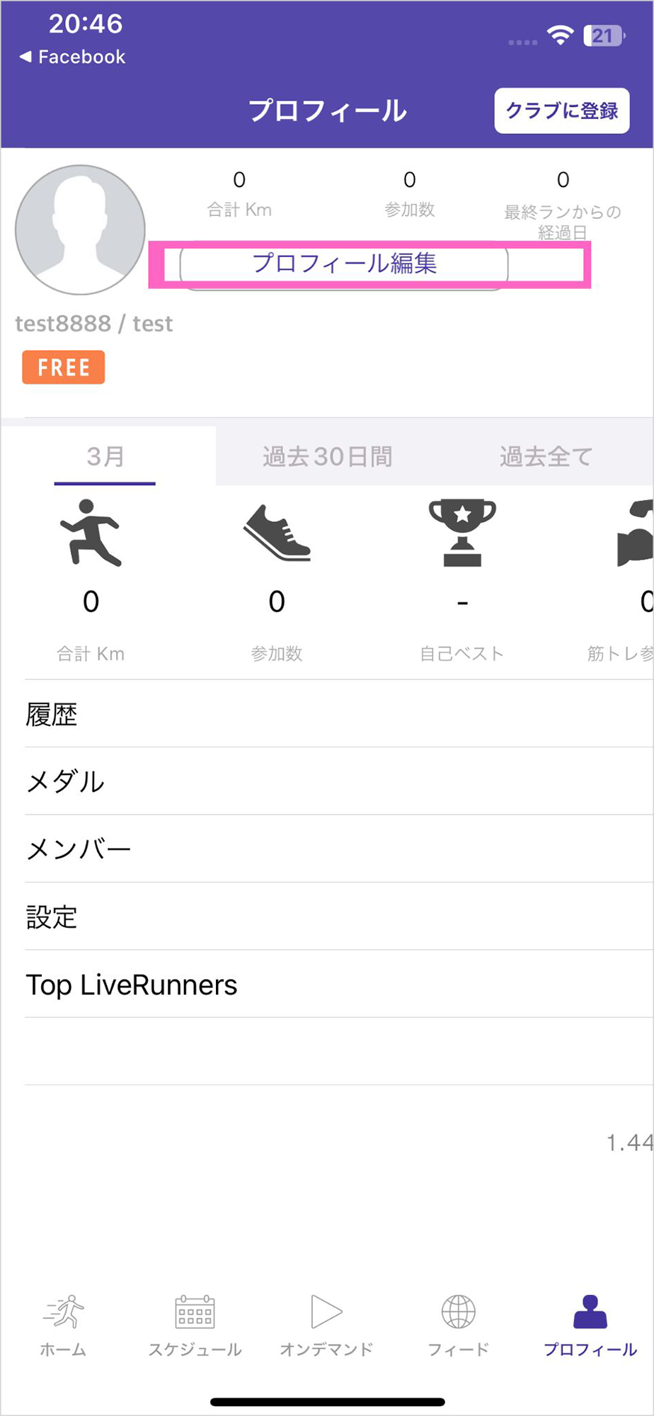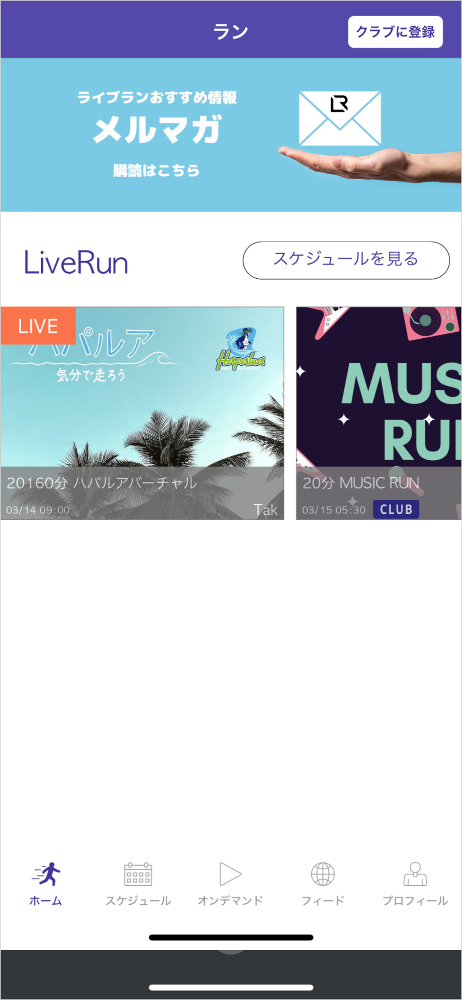 LiveRunアプリのプロフィール画面右上に『クラブに登録』ボタンがありますが、こちらはライブラン株式会社が提供する、特定有料サービスに参加するためのものです。『ハパルア・バーチャル・ファンラン』とは直接関係がありませんので、ご希望でない場合は登録不要です。一旦お支払いをされますと、ライブラン社のサービスのため、ホノルルマラソン日本事務局ではご返金対応等は一切できませんので、ご注意ください。