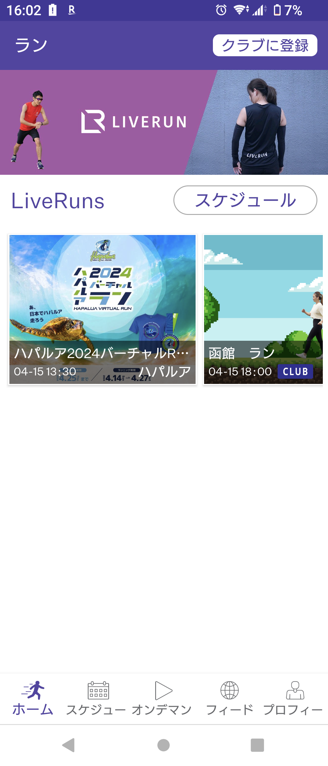 1. LIVERUNアプリを開き、「ハパルア2026 バーチャル・ファンラン」のセッションをタップ。