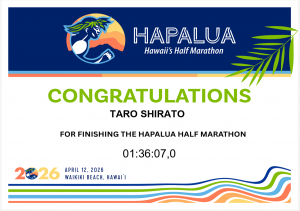 ホノルルマラソン協会のハパルア2026「RACE RESULT」では、参加者氏名やビブスナンバー(ゼッケン番号)を入力して、完走タイムの確認やデジタル完走証のダウンロードをすることができます。